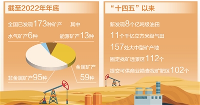 矿产资源是经济社会发展的重要物质基础,矿产资源勘查开发事关国计民生和国家安全。截至2022年年底,全国已发现173种矿产;2022年,我国近四成矿产储量均有上升……日前发布的《中国矿产资源报告(2023)》显示,我国推进实施新一轮找矿突破战略行动效果显著。