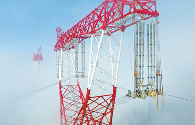 日前,江西省南昌县蒋巷镇的赣江南支流高空,安徽送变电工程有限公司施工人员在紧张架设武汉至南昌1000千伏特高压线路大跨越工程。