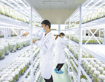 图为中国中医科学院中药资源中心(德兴)试验培训基地内,中药专家(前)与工作人员整理药用植物培养皿。
