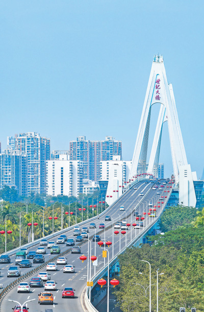 近日,海南省海口市世纪大桥两侧挂起了大红灯笼。春节临近,海口市主干道张灯结彩,远远望去,洋溢着浓浓的年味。