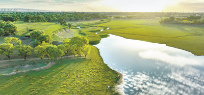 甘肃省张掖市奥林匹克森林公园,骑行爱好者们骑行穿过胡杨林。张掖市推进绿化工程,乱石滩“变身”森林公园,成了市民健身休闲的理想之所。 |