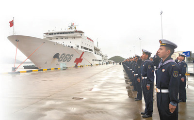 执行“和谐使命—2022”任务的中国海军“和平方舟”号医院船返回浙江舟山某军港,任务部队官兵代表在码头迎接。“和平方舟”号医院船是我国自主设计建造的首艘制式远洋医院船。自2008年入列以来,该船以“和谐使命”任务为主要载体,多次远赴海外开展人道主义医疗服务。 |