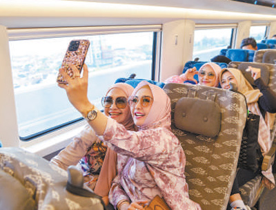 乘客在行驶中的雅万高铁车厢内拍照。作为“一带一路”倡议和中印尼两国务实合作的标志性项目,雅万高铁全线采用中国技术、中国标准。 |
