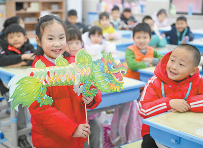 2月21日,江苏各地中小学正式开学。图为在昆山开发区青阳港学校,学生在课堂上展示寒假手工组装的花灯。