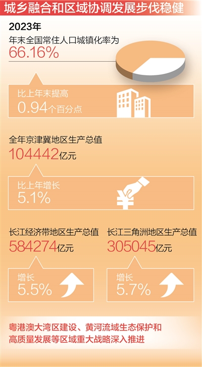 2023年,年末全国常住人口城镇化率为66.16%,比上年末提高0.94个百分点。全年京津冀地区生产总值超10.4万亿元,比上年增长5.1%;长江经济带地区生产总值超58.4万亿元,增长5.5%;长江三角洲地区生产总值超30.5万亿元,增长5.7%。粤港澳大湾区建设、黄河流域生态保护和高质量发展等区域重大战略深入推进。一个个增长极、动力源、发展带加速崛起,区域协调发展呈现新气象、新格局。