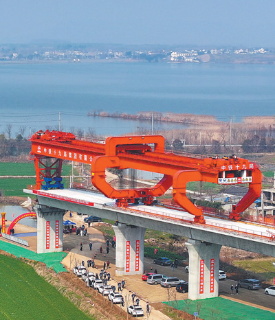 沪渝蓉高铁建成后,将串联起长三角城市群、长江中游城市群和成渝双城经济圈。图为沪渝蓉高铁南京段架设首榀箱梁。 徐 琦摄(人民视觉)