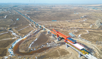 3月25日,在位于黑龙江省绥化市庆安县的哈伊高铁哈尔滨至铁力段施工现场,长32米、重约750吨的箱梁稳稳架设在安邦河特大桥桥墩上,标志着哈伊高铁哈铁段建设进入架梁施工阶段。