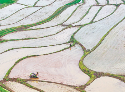 目前,湖南进入早稻耕种的繁忙时节,衡阳市衡东县的农民抢抓农时开展早稻耕种,确保早稻的耕种面积,为粮食增产、农民增收打基础。图为4月14日,衡东县吴集镇早稻插秧作业场景。