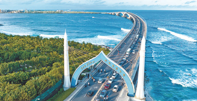 由中交二航局实施的援马尔代夫中马友谊大桥后续维保技术援助项目日前正式开工。项目工期36个月,将对大桥进行初次修复及预防性养护等。图为中马友谊大桥远景。