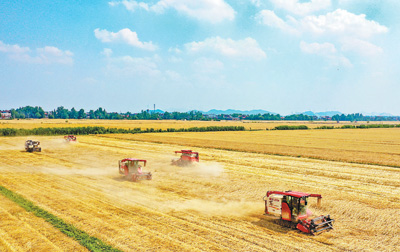 江西省九江市彭泽县棉船镇的小麦陆续进入成熟期,该镇迅速调运150余台收割机,趁着晴好天气,集中时间抢收小麦。图为5月17日,收割机在麦田有序作业。