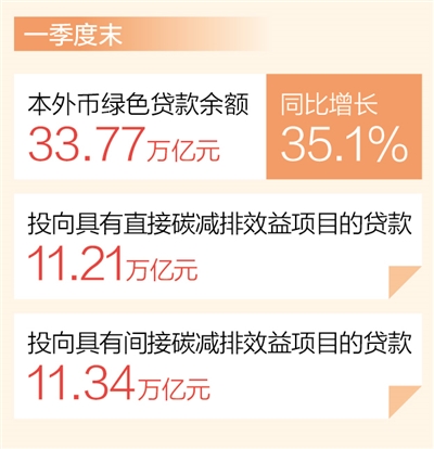 本报北京5月19日电 (记者吴秋余)近日,中国人民银行发布最新数据显示:今年一季度,我国绿色贷款保持高速增长,截至一季度末,本外币绿色贷款余额33.77万亿元,同比增长35.1%,高于各项贷款增速25.9个百分点,一季度增加3.7万亿元,季度增量创历史新高。其中,投向具有直接和间接碳减排效益项目的贷款分别为11.21万亿元和11.34万亿元,合计占绿色贷款的66.8%。