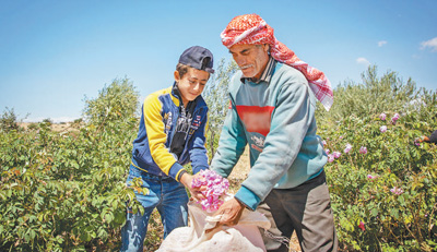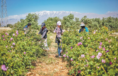 在大马士革农村省侯赛因村,人们忙着采摘玫瑰花。 |
