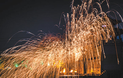 碎炭、起火、熔铁、扬水、打花……夜晚,在河南开封清明上河园景区,一场流光溢彩的“打铁花”民俗文化表演正在上演(见图,受访者供图)。随着1600摄氏度的铁水在夜空中幻化成漫天的“星光”,绚烂、璀璨,瞬间惊艳全场,现场观众由衷发出阵阵惊叹。而这一巧夺天工的“重金属艺术”正是开封打铁花第二十二代传承人刘小松及其团队的作品。
