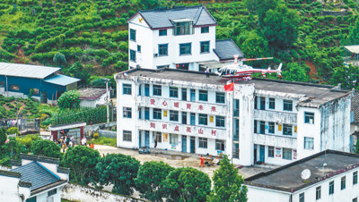 6月21日,救援直升机停靠在安徽黄山市歙县绍濂乡小溪中心小学楼顶运送救灾物资。 樊成柱摄(影像中国)