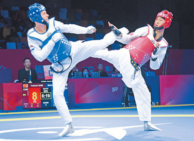 2023世界跆拳道大满贯冠军系列赛暨奥运直通卡赛,中国队选手梁育帅(右)在比赛中。 |