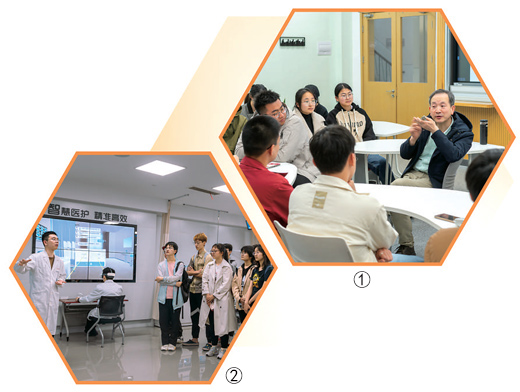 图①:复旦大学“强国之路”思政大课小班讨论课上,航空航天系教授艾剑良(右一)与学生交流。 |