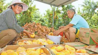 近年来,河南省虞城县大力发展水果种植、果品加工冷藏、林下养殖等项目,并将采摘等特色产业与乡村旅游相结合,走出一条产业兴、生态美、百姓富的可持续发展之路。图为日前,城郊乡大郭楼村村民对采摘后的鲜桃进行分装。