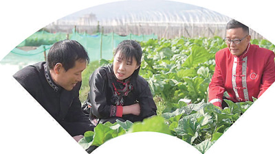 图为钟团玉(左二)在田间地头和村民交流。 |