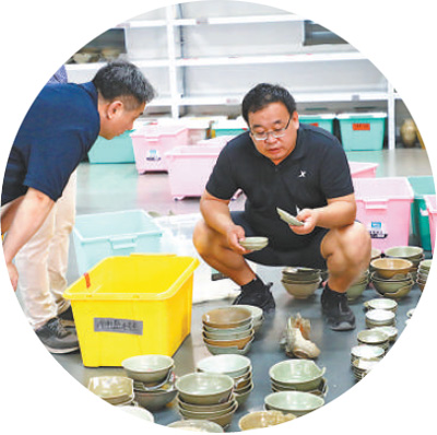 梁国庆(右)在整理出水文物。 |