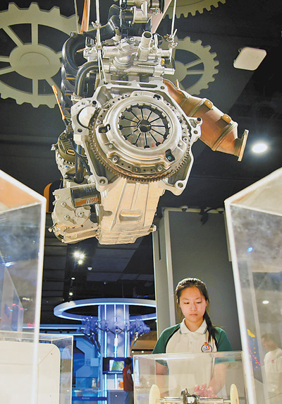 7月7日,一名中学生在山东省枣庄市科技馆了解内燃机工作原理。 刘明祥摄(新华社发)