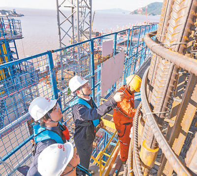 西堠门公铁两用大桥墩身施工现场。 |