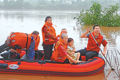 7月11日,重庆市长寿区云台镇,救援人员转移被困群众。