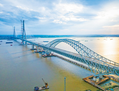 常泰长江大桥连接江苏省常州市和泰州市,全长10.03公里,全桥铺装总面积超25万平方米,是长江上首座集高速公路、城际铁路、普通公路于一体的过江通道。大桥由中交二航局参建,全桥预计2025年上半年建成。