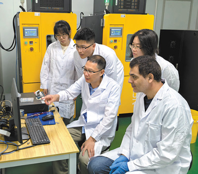 马紫峰(左三)带领团队开展钠离子电池材料性能分析。 |