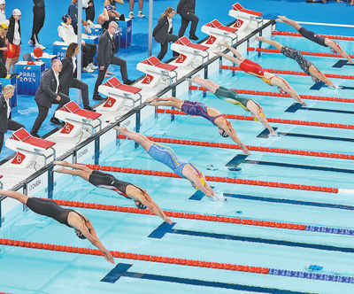 女子4×100米自由泳接力决赛,中国队选手杨浚瑄(右三)在比赛中。 |