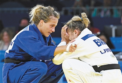 当地时间7月28日,巴黎奥运会柔道女子52公斤级铜牌赛后,意大利选手朱弗里达(左)与巴西选手皮门塔交流。 新华社记者 李 安摄