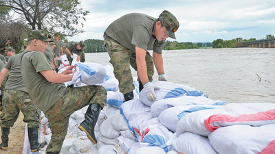 7月29日,在松花江支流牡丹江的黑龙江省宁安市区段,当地干部群众正在堆砌防洪子堤。 张春祥摄(人民视觉)