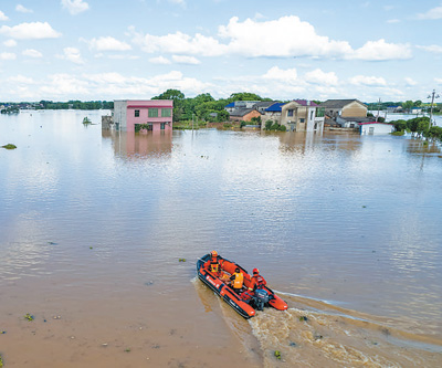 7月29日,在湖南省涓水湘潭县河口镇华中村堤段附近,救援人员在搜寻被困群众。 |