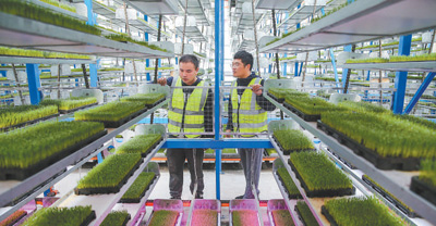 连云港市海州区5G智慧农场育秧室内,工人在查看水稻秧苗生长情况。 |