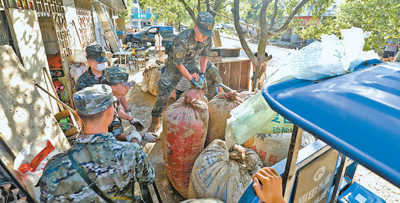 8月1日,湖南省资兴市州门司镇,武警战士在清理淤泥。