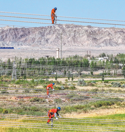 新疆库尔勒市一条750千伏输电线路工程现场,施工人员正在高空架设电网。 史 俊摄(影像中国)