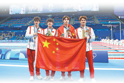 在4日进行的男子4×100米混合泳接力决赛中,由徐嘉余、覃海洋、孙佳俊、潘展乐组成的中国队,以3分27秒46的成绩夺冠,美国队和法国队分获银牌、铜牌,这是中国队奥运历史上首次夺得该项目金牌。