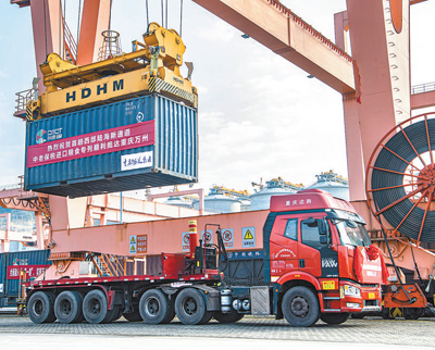1月4日,装载40个集装箱约1000吨粮食的西部陆海新通道中老铁路首趟保税进口粮食直达专列(老挝孟赛—重庆万州)抵达重庆万州新田港站。图为工作人员操作机械进行集装箱吊装作业,将专列货物转运至公路物流。 |