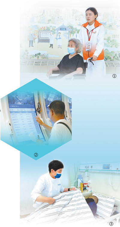 图①:江苏省中医院为80岁以上老人提供就医零等待服务。图为敬老接待专人在送腿脚不便的老人就医。 |