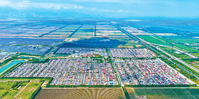 8月7日,俯瞰位于贺兰山东麓的宁夏银川市永宁县闽宁镇原隆村,整洁的民居被酿酒葡萄基地环绕,屋顶的蓝色光伏板与光伏产业园区遥相呼应,构成一幅和美乡村的生态画卷。图为棋盘状整齐划一的原隆村。
