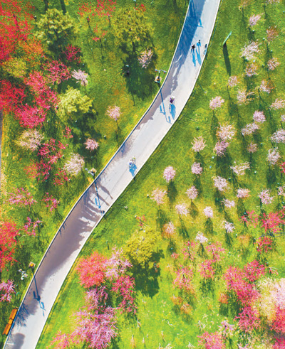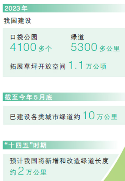 我国将绿色发展理念融入城乡规划建设管理中,稳步推进建设连通区域、城市、社区的城乡绿道体系。2023年,我国建设口袋公园4100多个、绿道5300多公里,拓展草坪开放空间1.1万公顷,截至今年5月底,已建设各类城市绿道约10万公里。