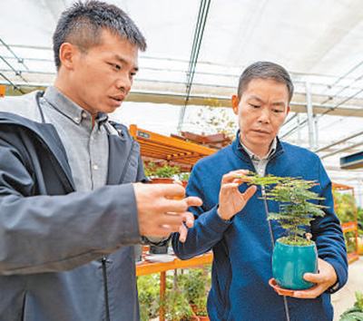 胡发炜(右)在红河谷农业园区查看盆栽生长情况。 |