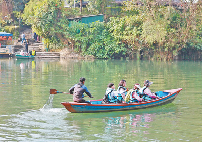 中国游客在尼泊尔费瓦湖上泛舟。 |