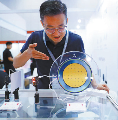 前不久,第十五届中国光电子产业博览会在北京国家会议中心举办。本届博览会吸引了1000余家光电子产业的企业参展,集中展示了红外微光技术与应用、激光与智能制造、光电芯片等领域的创新产品。图为一家展商在展示光学集成发射模块晶圆产品。