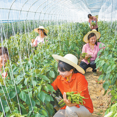 湖北省宜昌市秭归县磨坪乡磨坪村合作社社员在生态农业产业园采摘青椒。 |