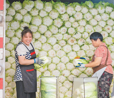 青海省西宁市大通县永丰村村民正在采收甘蓝。西宁市依托特殊的海拔和气候优势,加快高原冷凉蔬菜基地建设,累计打造百亩以上规模化标准化蔬菜生产基地210个、千亩生产基地41个、万亩示范基地6个。 |