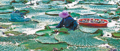 江苏省泰州市,芡实、菱角、莲藕等水生蔬菜陆续上市,满足市场供应。图为农民在泰州市姜堰区顾高镇申俞村采收芡实。 |