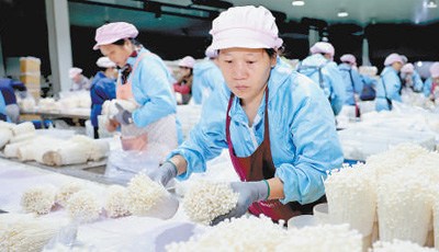 安徽省铜陵国家农业科技园区内的安徽康恒生物科技有限公司食用菌生产车间,工人们在流水线上采收金针菇,供应市场。 |