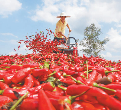 四川省达州市达川区堡子镇长垭村,村民在晾晒收获的红辣椒。 |