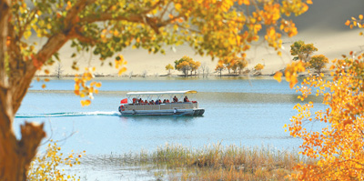 新疆巴音郭楞蒙古自治州尉犁县持续改善生态环境,完善基础设施建设,拓宽生态优势转化为经济优势的路径,文旅产业蓬勃发展。图为10月19日,游客乘船游览尉犁县景区。