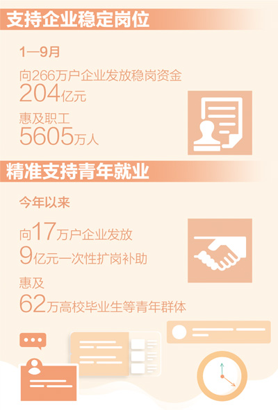 二是继续对不裁员少裁员的参保企业实施稳岗返还政策。扩大资金使用范围,在现行职工生活补助、缴纳社会保险费、转岗培训、技能提升培训等稳定就业岗位支出的基础上,新增降低生产经营成本支出,进一步支持企业发展。1—9月,各地通过“免申即享”的方式,向266万户企业发放稳岗资金204亿元,惠及职工5605万人,有效支持企业稳定就业岗位。